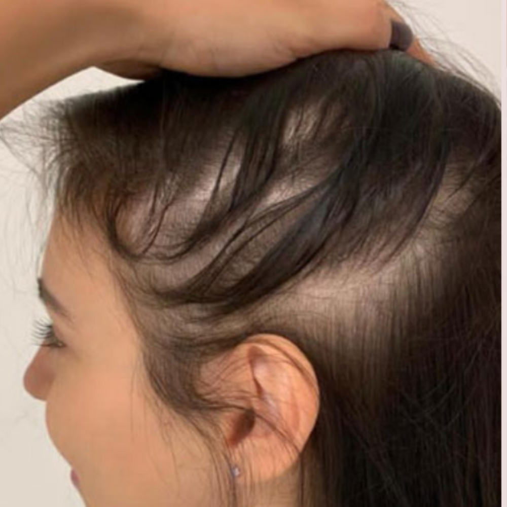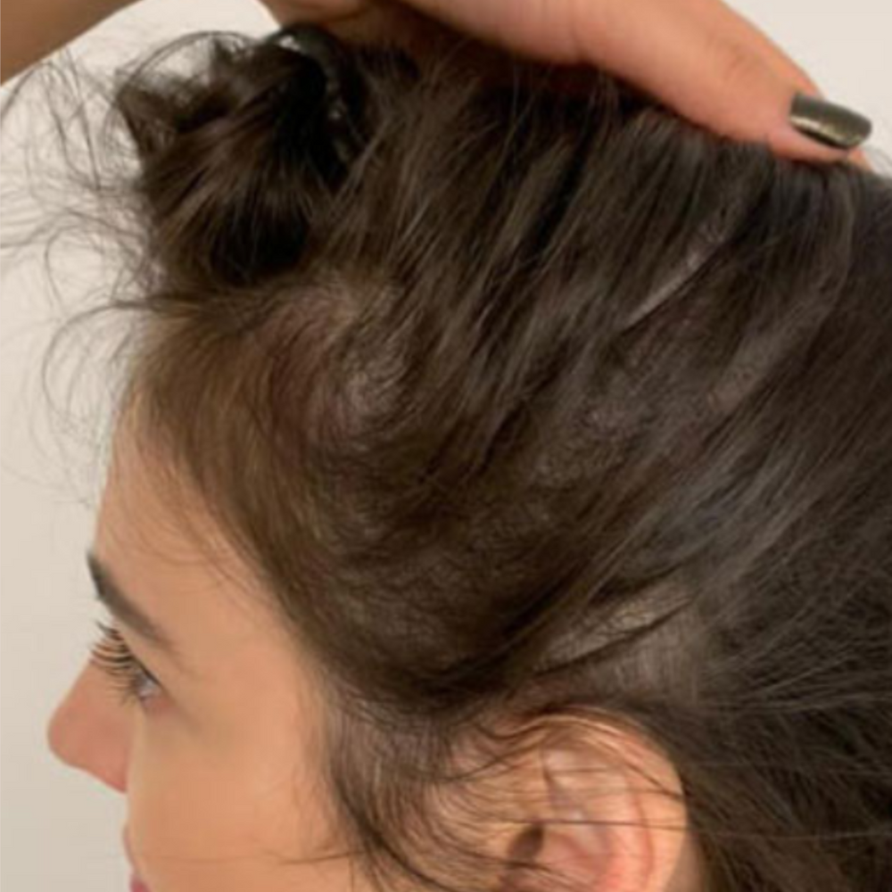 Part your hair into sections. Spray Alyra directly onto your scalp in thinning areas. Focus on your hairline, crown, and part.